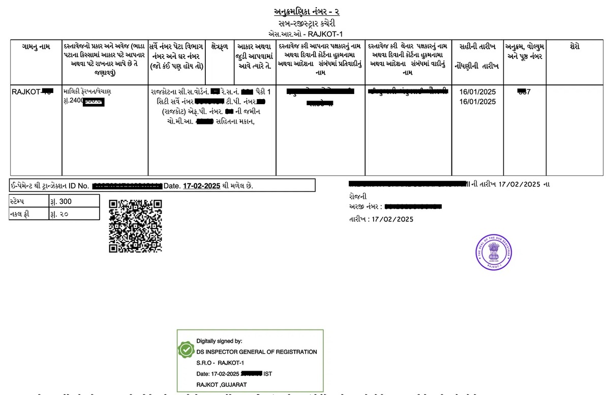 | Document Number | દસ્તાવેજ નંબર | Unique serial number assigned to your deed at time of registration |